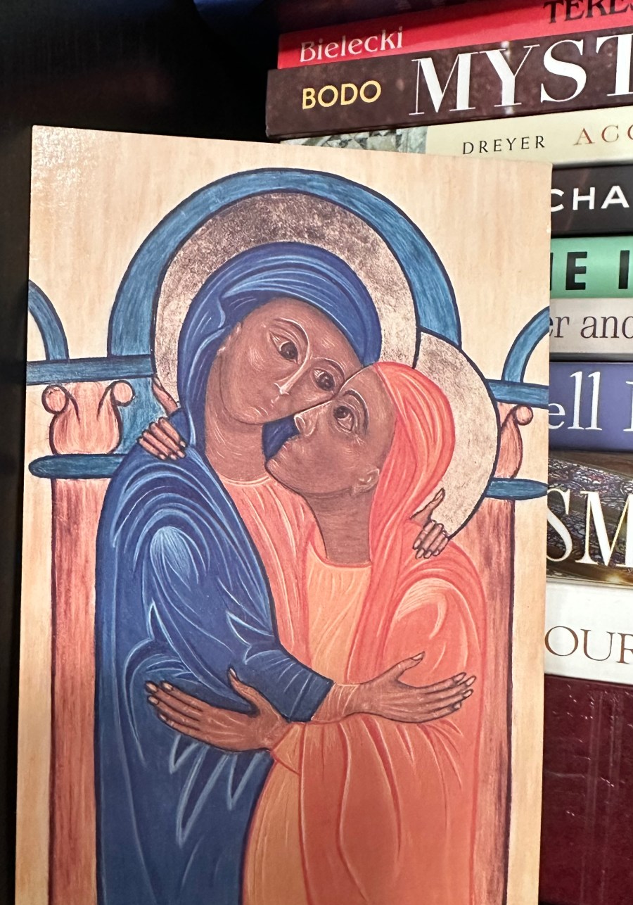 The image I selected today was a postcard given to me by my pastor, Fr. Tony, in the early years of my adult faith formation. I was beginning to seriously consider what I was being called to do and be in life, what following Jesus means and reflecting on my Catholic faith honestly, all the aspects, worthy and true and sadly, not so admirable. I was considering different ministries and religious communities at the time and we talked about the encounter of Mary and Elizabeth and the opportunities of ministering to other women. This postcard depicts an icon titled “Mary visits Elizabeth” (1984) painted by Sr. Joan Tuberty. I love that their skin tones are darker, as women of the Middle East. I love the soulful gaze of each woman, eye to eye, peering deep, seeing a truth, deeper than the eye can see. In a community newsletter, Sr Joan, an accomplished iconographer, said “Icons are scripture visualized and companions for our spiritual journey.” This icon has been a companion on my journey the past 30 years.
