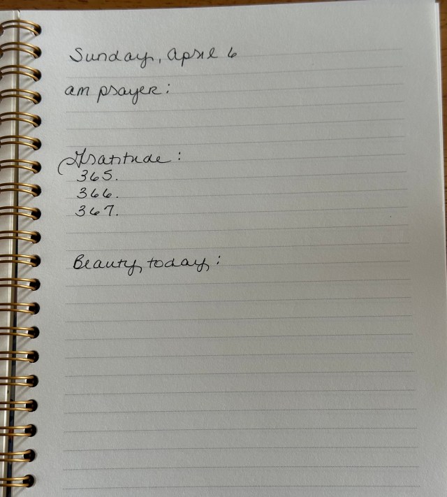 In a previous blog post I mentioned a new practice of keeping an ongoing list of my daily gratitude, tracking the sequential numbers versus jotting down three new entries each day. To this practice I have added an area to reflect on beauty that crossed my path each day. Besides my daily spiritual and creative reflections, I write in my daily Examen journal the consolations or graces and desolations each day. Before those movements of the Spirit, I note my reflections of gratitude and beauty. I have included a sample of today’s page, in this blog post, before writing in it later today. Try it and let me know what you think.