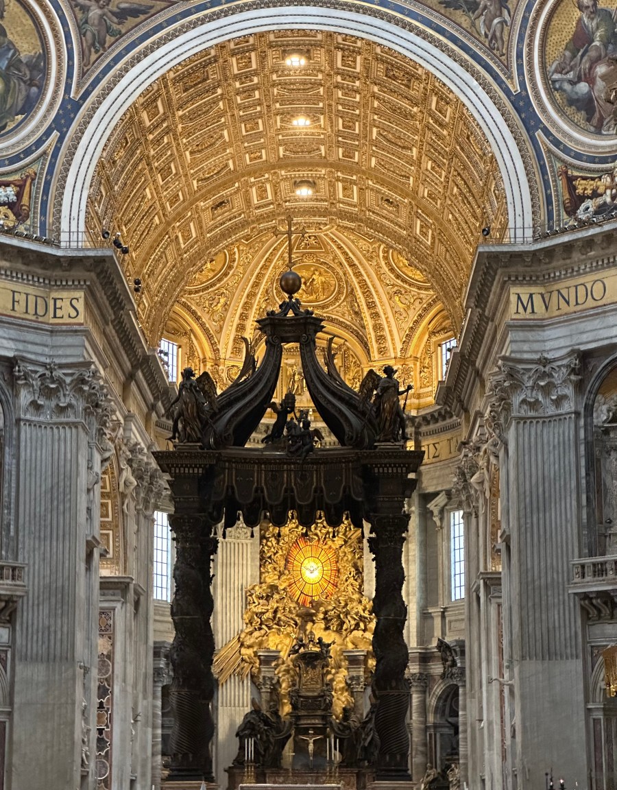 Photo: The Holy Spirit window, as seen through the Baldachin, or canopy, over the altar, both designed by Bernini, in St. Peter’s Basilica in Rome, taken during my 2023 pilgrimage.
