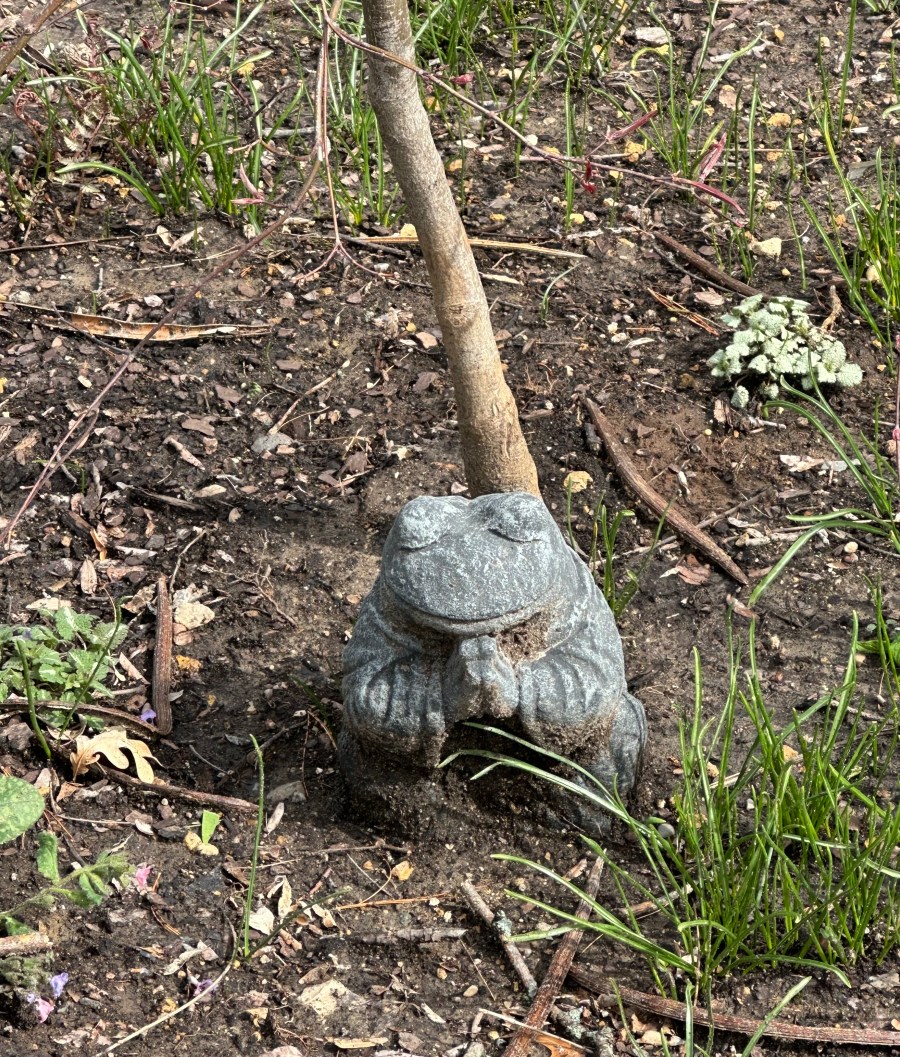 Image: a cute frog statue in one of the emerging beds at Hornabaker Gardens, Princeton IL.