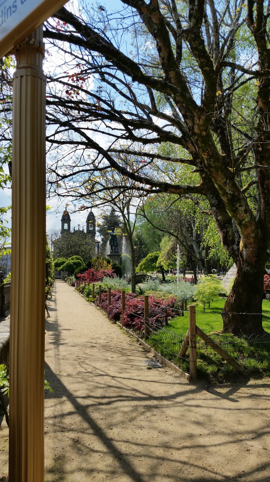 Image: A garden and walkway in Santiago de Compostela, Spain.